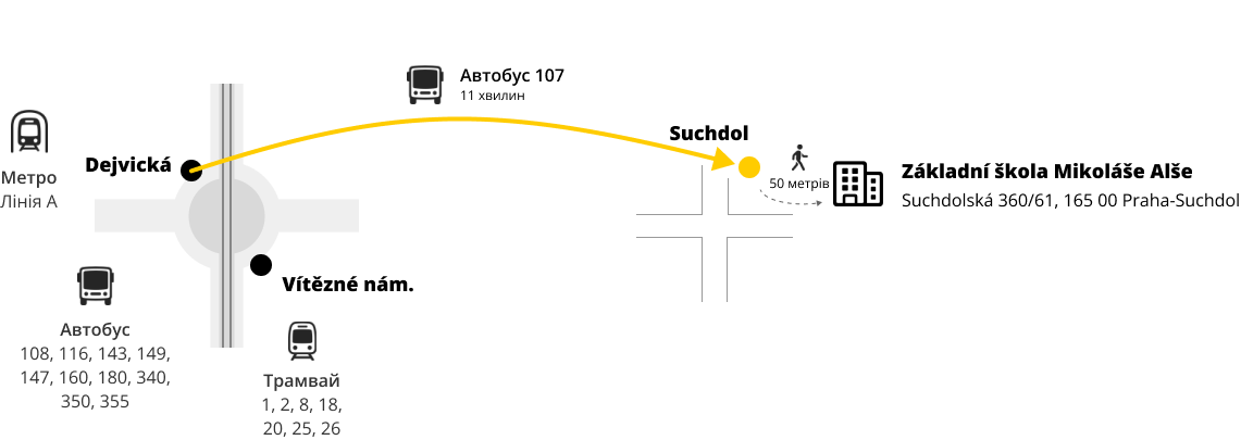 Ми викладаємо в "ZŠ Mikoláše Alše" у празькому "Suchdole", до якого легко дістатися з будь-якої частини Праги.